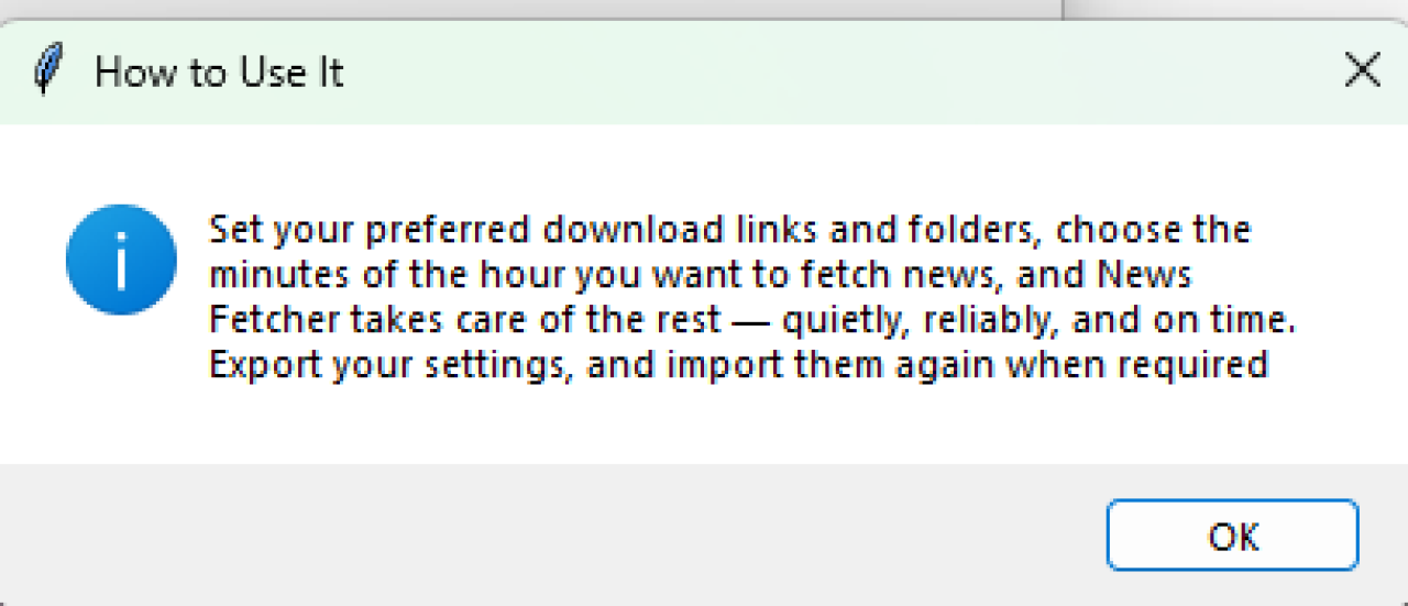 News Fetcher is a lightweight, tray-based Windows utility that automatically downloads up to 10 configurable MP3 news bulletins every hour.